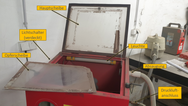 Die Sandstrahlbox steht im Metallraum in der vorderen Ecke.